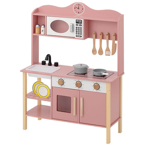 動かして遊べる楽しい仕掛けがたくさんついた、電子レンジ・オーブン付きおままごとキッチン。お鍋やヘラ・お皿などの小物付き。