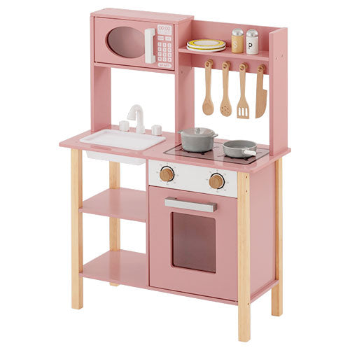 動かして遊べる楽しい仕掛けがたくさんついた、電子レンジ・オーブン付きおままごとキッチン。お鍋やヘラ・お皿などの小物付き。