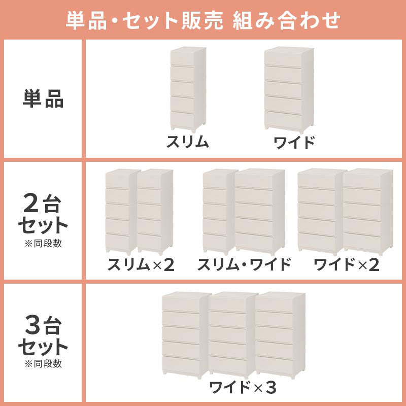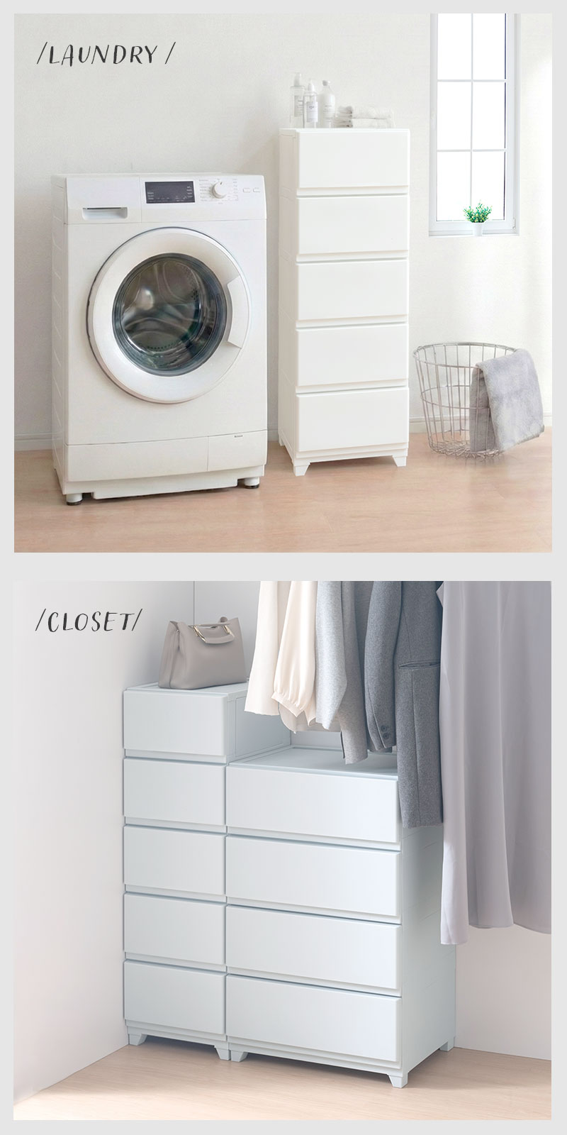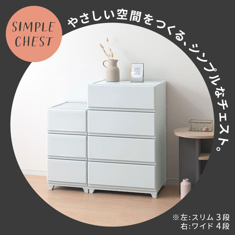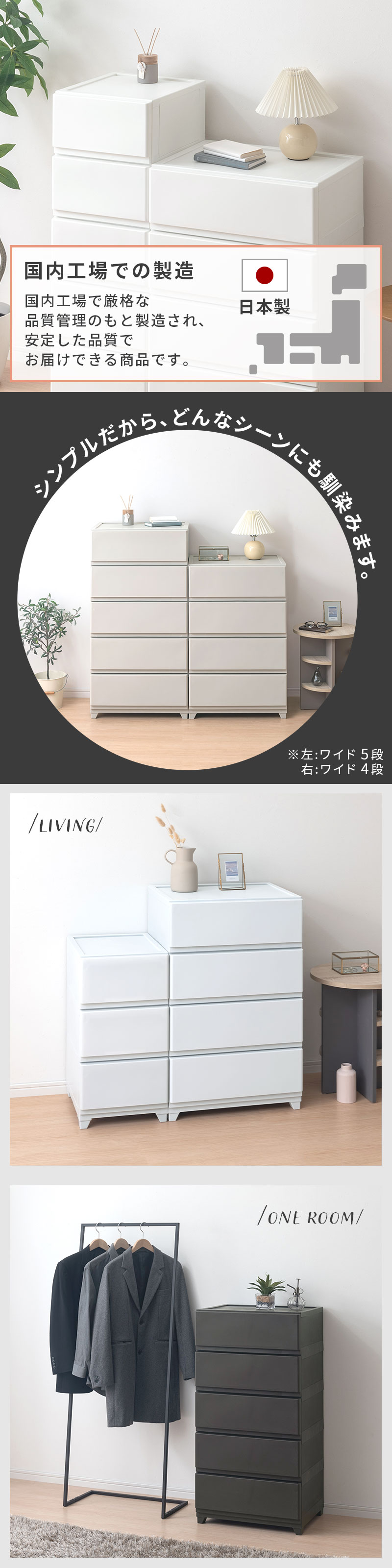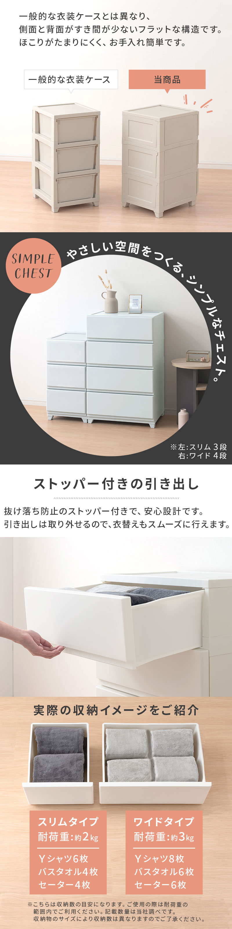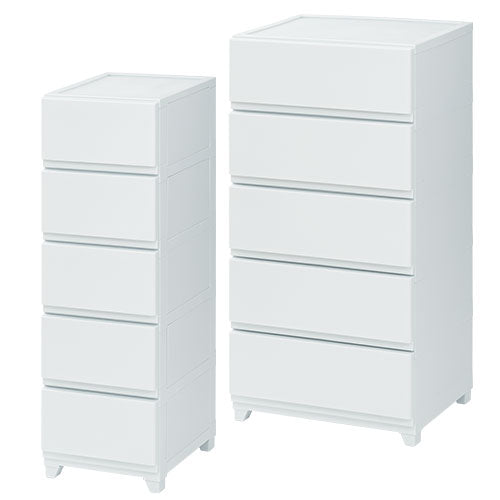 収納も自由自在な壁付き樹脂チェスト。省スペースに置けるスリムと、大容量のワイドの2タイプからお選びいただけます。