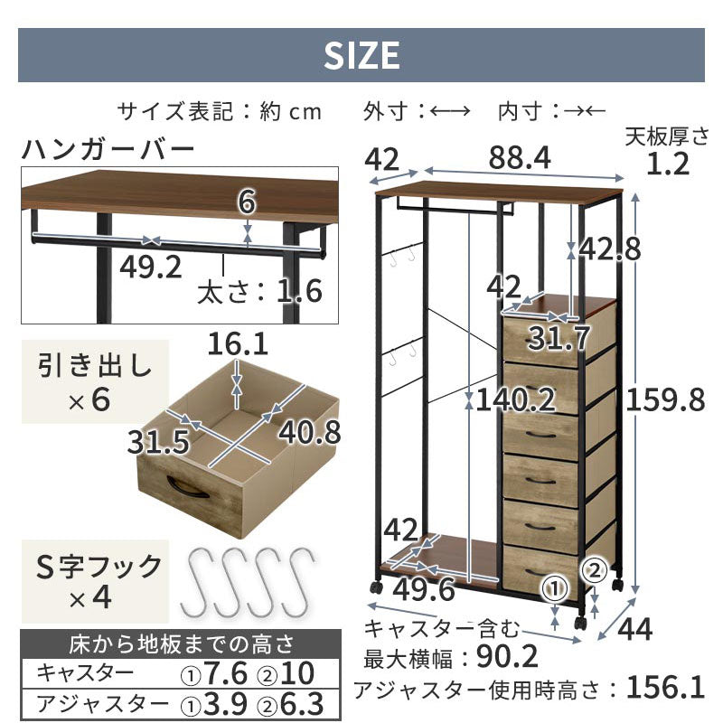 ハンガーラック クローゼット ワードローブ パイプハンガー コートハンガー 洋服ラック 衣類ラック 収納ラック ラック ワゴン ハンガー掛け コート掛け チェスト 収納棚 衣装棚 衣装ケース シェルフ 収納家具 ハンガーポール 引き出し付き 引き出し 6杯 ハイタイプ 移動 キャスター付き アジャスター S字フック付属 通気性 木製 スチール 不織布 大型 大容量 ワンピース ロングスカート ロングコート 収納 約 幅90cm 奥行44cm 高さ160cm 移動らくらく 簡単 模様替え 棚 棚付き 省スペース かける収納 置く収納 しまう収納 引き出し収納 衣類収納 洋服収納 小物収納 帽子掛け バッグ収納 引っ掛け収納 収納付き 一人暮らし ワンルーム 賃貸 子供部屋 ベッドルーム 寝室 リビング 会社 オフィス 新居 新生活 引っ越し 衣替え 季節収納 北欧 モダン ナチュラル シンプル おしゃれ かわいい ホワイト オーク ウォールナット 茶 黒 白 ベージュ 完成品 開梱設置 組立不要 組み立て不要