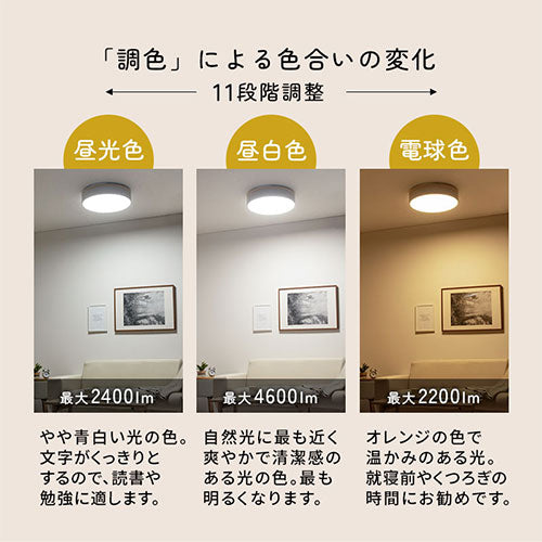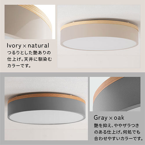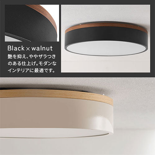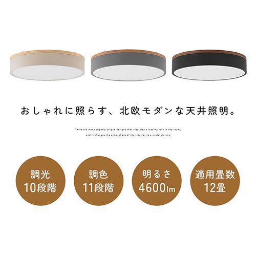 生活シーンに合わせ明るさ・色の調節ができる調光調色機能付きシーリングライト。木枠がおしゃれな丸型フラットタイプです。
