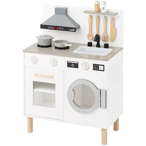 コンパクトでリビングに置いても馴染むおままごとキッチン。光って音が鳴る換気扇や洗濯機風の収納も付いています。