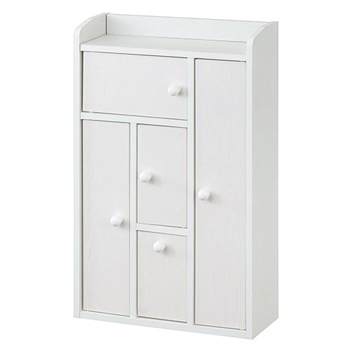 扉付きのスリムなトイレラック。収納場所が細かく分かれているので使い分けしやすくなっています。