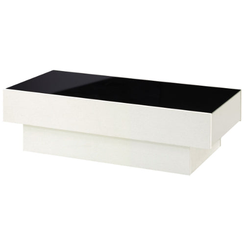 ブラックガラスの天板と、木目の質感が美しく調和したセンターテーブル。両端の引き出しが収納力もしっかり兼ね備えています。