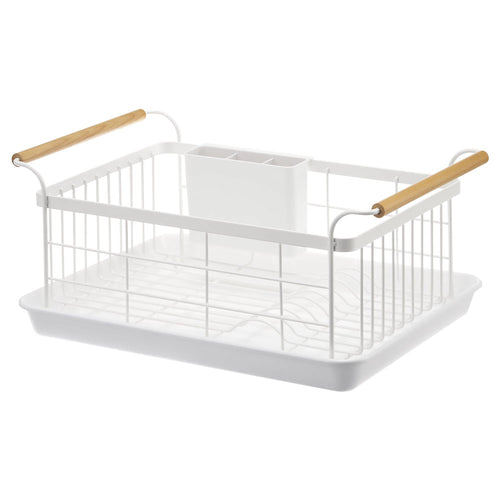 ホワイトのスチールと天然木の組み合わせが美しい水切りバスケット。移動に便利な持ち手や、取り外しできるカトラリーポケットが付いているのでデザイン性だけでなく実用性にも優れた水切りバスケットです。