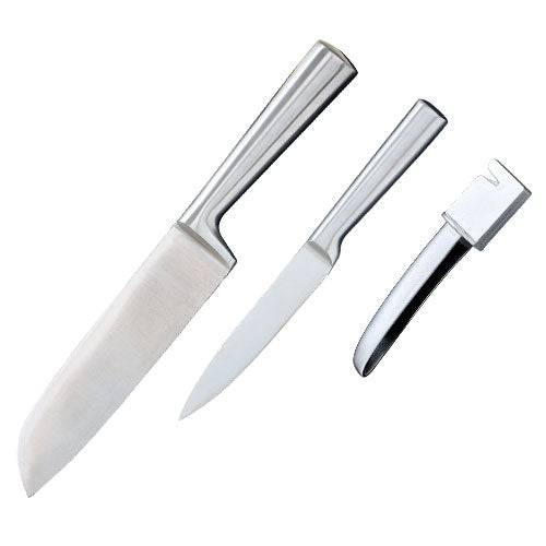 三徳包丁とペティナイフにシャープナーが付いた便利な3点セット。オールステンレス包丁なので丈夫で長持ちします。