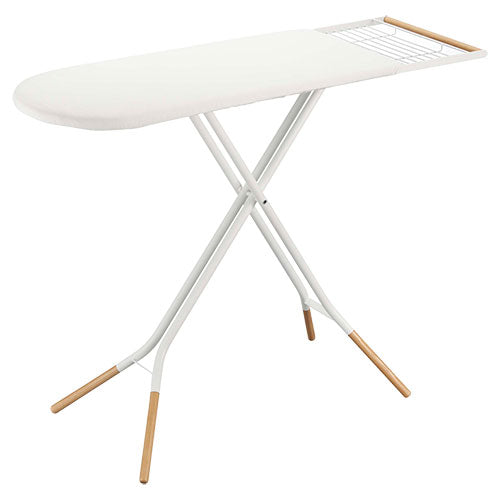 便利なアイロン置き台や、スプレーやハンガーを掛けられる木製バー付き。レバー操作で14段階の高さ調節も可能です。シンプルなデザインで、折りたたんでそのまま置いてもおしゃれ。天然木のナチュラルなアクセントが明るい雰囲気を演出してくれます。