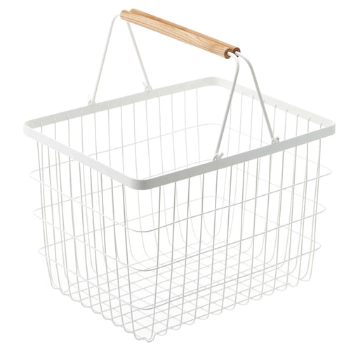 白いスチールが爽やかなランドリーバスケット。持ち運びにも便利な天然木の取っ手が温かみをプラスします。