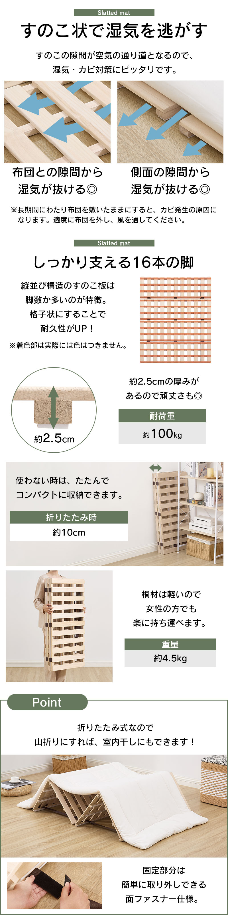 天然木桐材を使用した4つ折り式すのこマット。敷布団やマットレスの下に敷くことで、湿気・カビ対策にピッタリです。