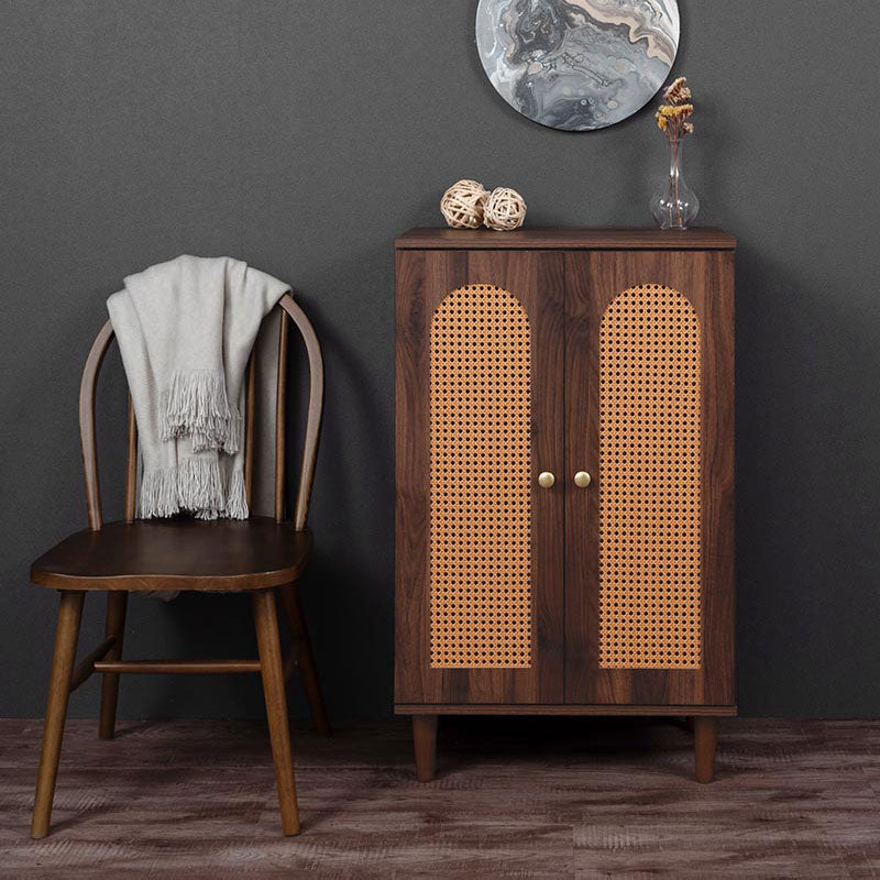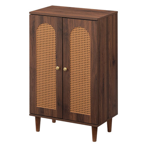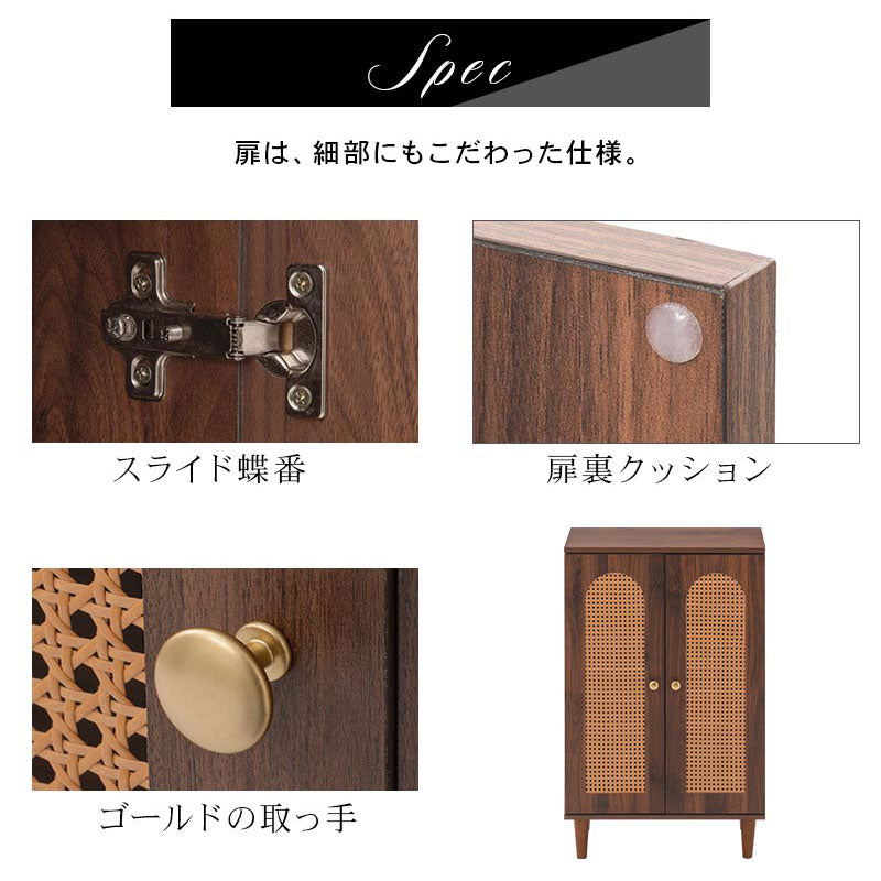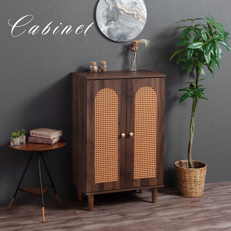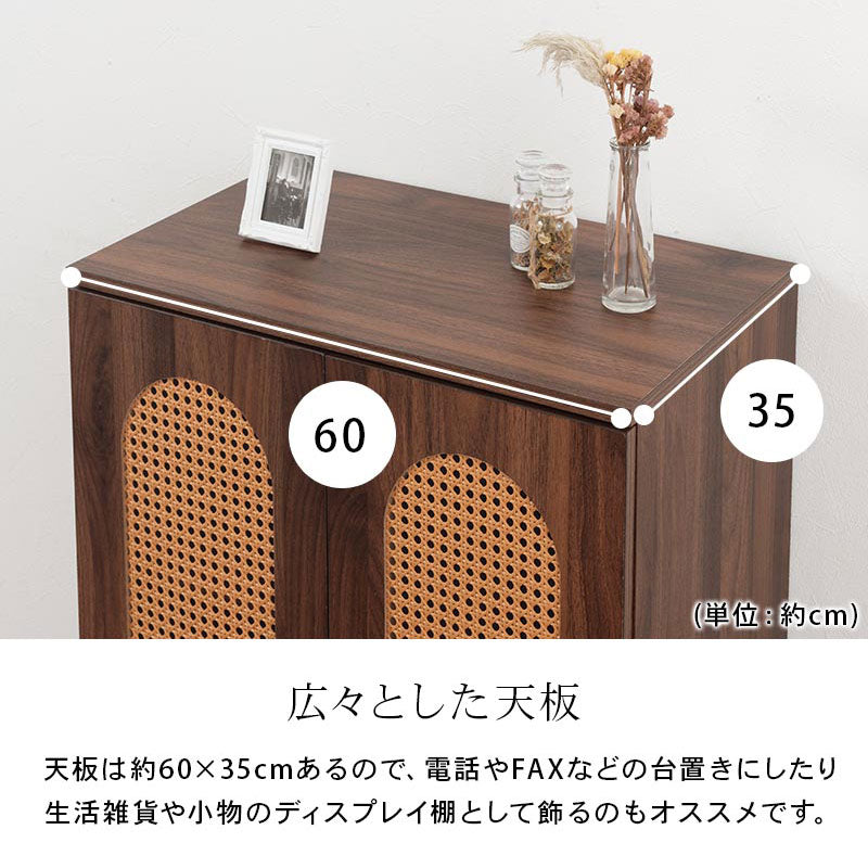 木製×ラタン調のおしゃれなキャビネット。ディスプレイできる天板に収納物を隠せる扉付き。