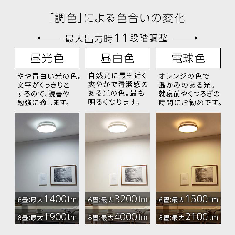 生活シーンに合わせ明るさ・色の調節ができる調光調色機能付きシーリングライト。フラットタイプでお部屋を広く見せられます。