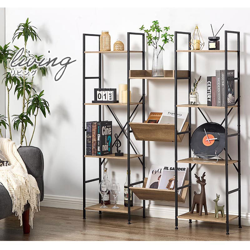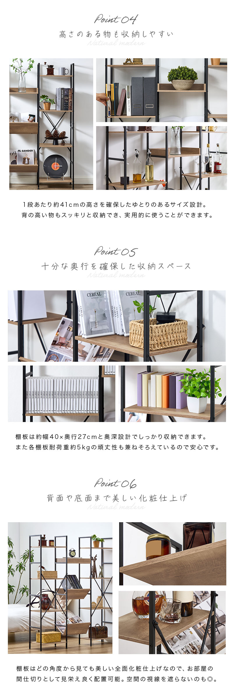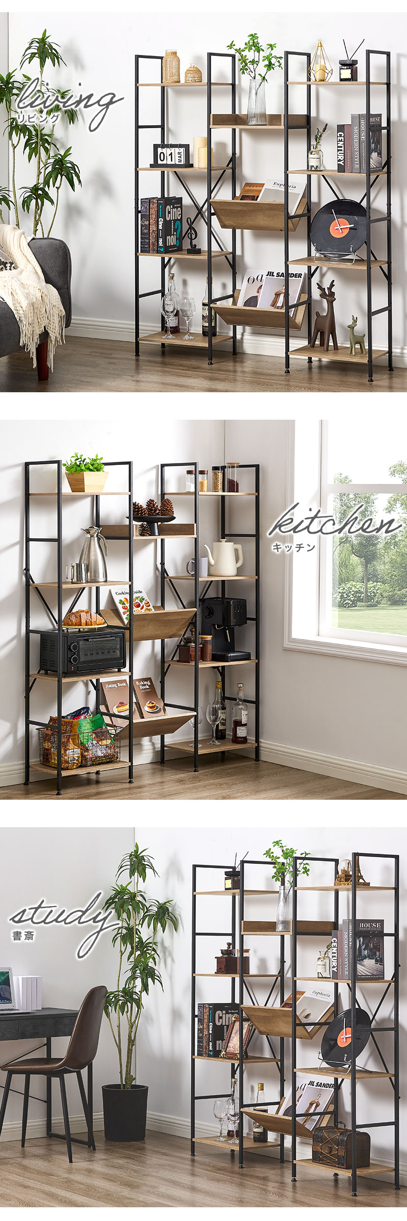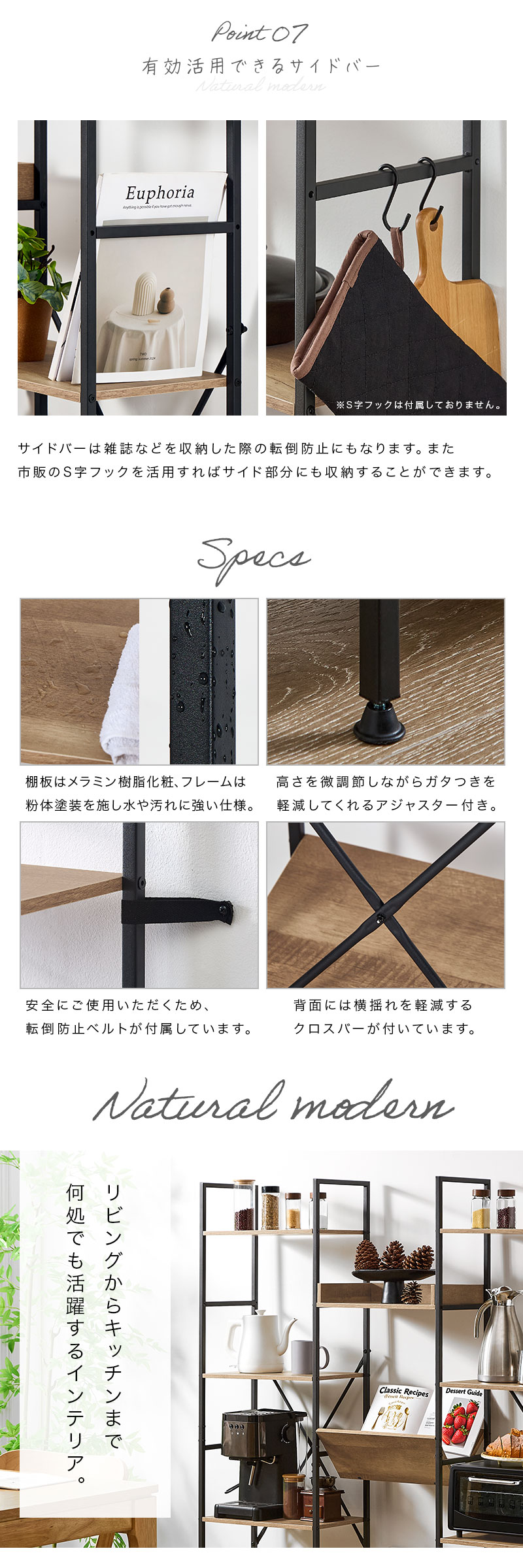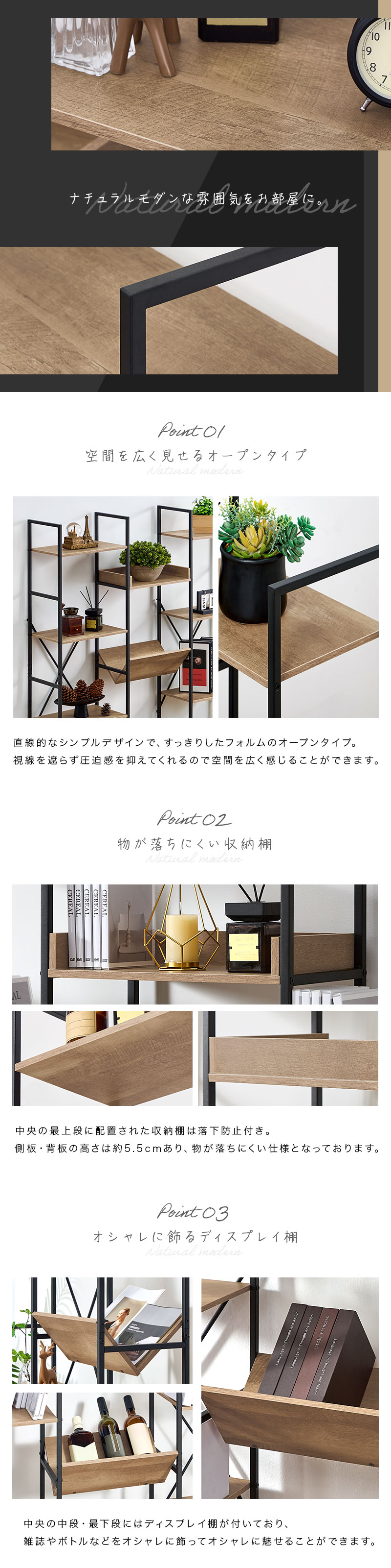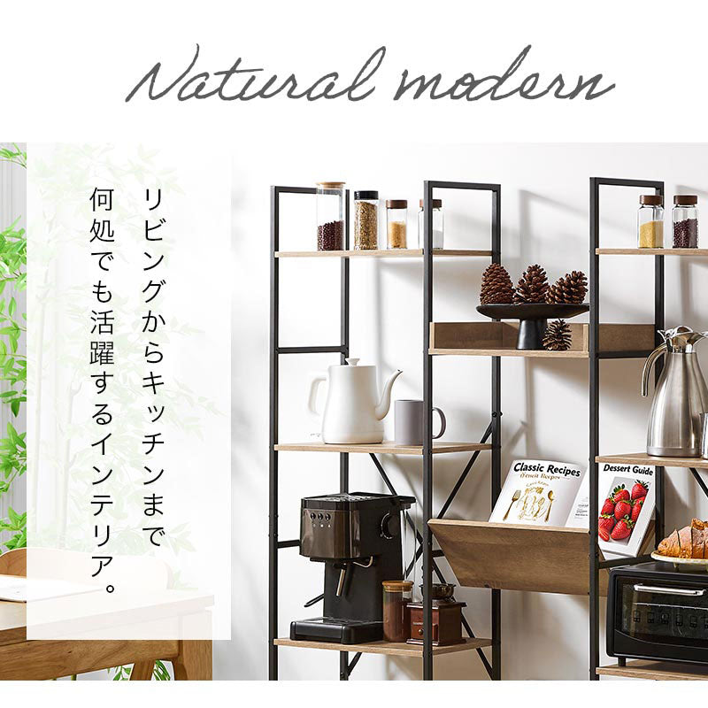 温かみのある棚板とモダンなスチールを組み合わせたオープンラック。ナチュラルモダンなスタイルにぴったりのアイテムです。