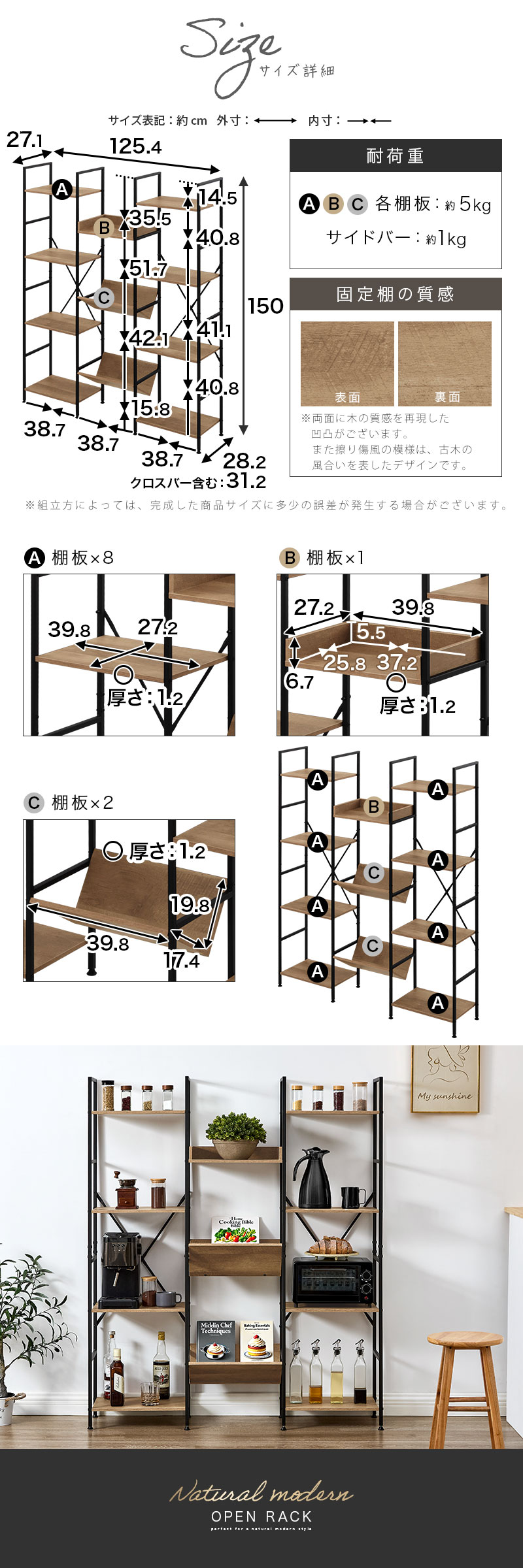 オープンラック 大型 スチールラック 幅125 奥行30 ワイド ラック シェルフ キャビネット 木製 スチール オープンシェルフ 棚付きラック L字棚