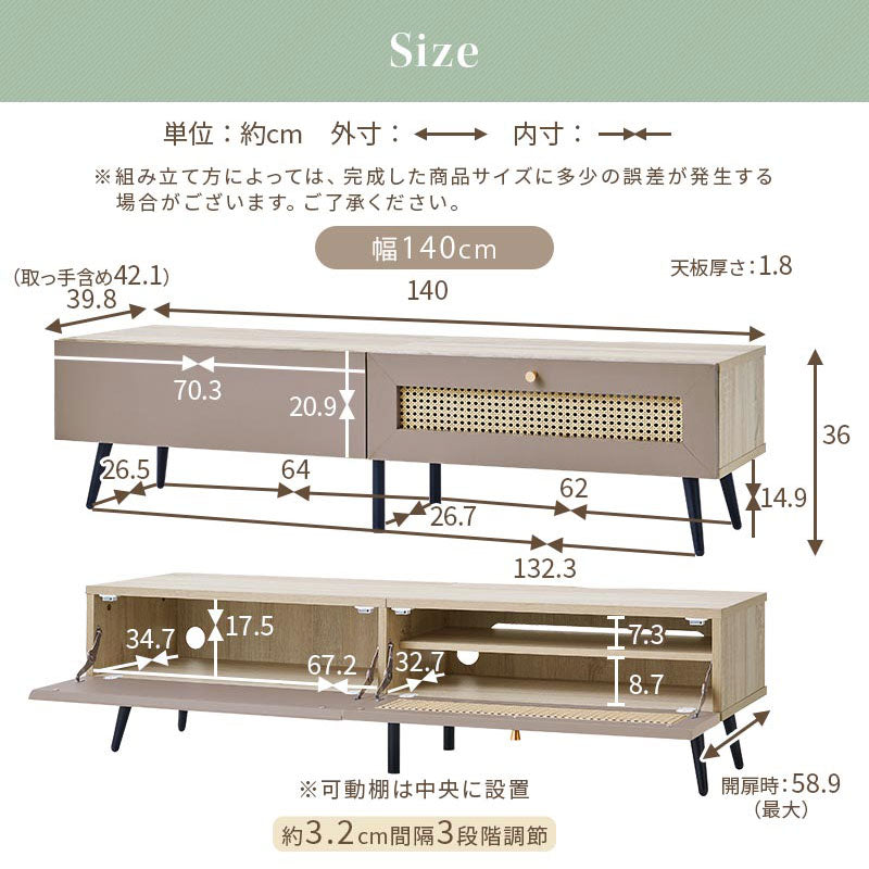 テレビ台 TV台 ローテレビ台 ラタン調テレビ台 テレビボード テレビボード収納 ローテレビボード TVボード AVボード ローボード ディスプレイボード 収納ボード 棚 飾り棚 ラック テレビラック TVラック ローラック ロータイプテレビ台 ディスプレイラック 収納ディスプレイラック オーディオラック 収納ラック キャビネット 収納棚 木製 木目 木目柄 木目調 ウッド ラタン調 ラタン風 幅140cm 幅180cm 140cm 180cm 140cm幅 180cm幅 ワイド ロング 大型 32型 40型 50型 60型 65型 32インチ 40インチ 50インチ 60インチ 65インチ まで対応 60型対応 65型対応 大型TV対応 扉付き 扉付き収納 開き戸 wifi wi-fi ルーター ルーター収納 隠せる収納 隠す収納 棚板 棚付き 可動棚 収納付き 大容量収納スペース コード穴 AV収納 TV収納 テレビ ゲーム機収納 ゲーム機 ゲームソフト HDD ハードディスク レコーダー DVDプレイヤー ブルーレイレコーダー CD DVD Blu-ray リモコン 推し活 収納 グッズ収納 見せる収納 収納家具 整理整頓 整理 脚付き スチール脚 低め 低い ロータイプ 薄型 薄い コンパクト リビング 寝室 和室 ファミリー 家族 一人暮らし ワンルーム 新生活 新居 引っ越し シンプル 可愛い かわいい カジュアル モダン 北欧 韓国 韓国インテリア 風 ジャパンディ 淡色インテリア インテリア 家具 オーク ナチュラル ベージュ グレージュ ブラウン グレー くすみカラー ツートン ツートンカラー ツートーン ツートーンカラー Toffy トフィー PUTUPUTU プトゥプトゥ おしゃれ オシャレ 完成品 開梱設置 組立不要 組み立て不要