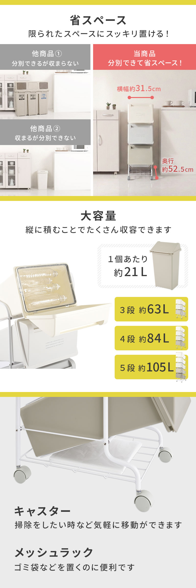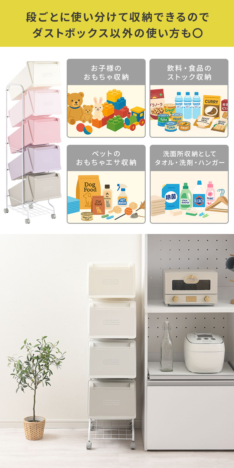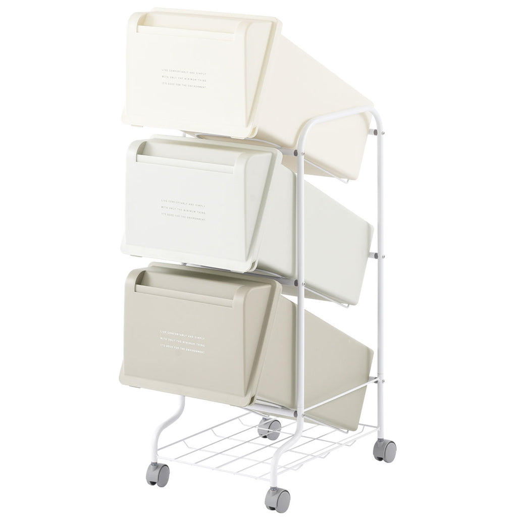 縦に積んで省スペースに大容量の分別ダストワゴン。キャスター付きで移動も可能です。
