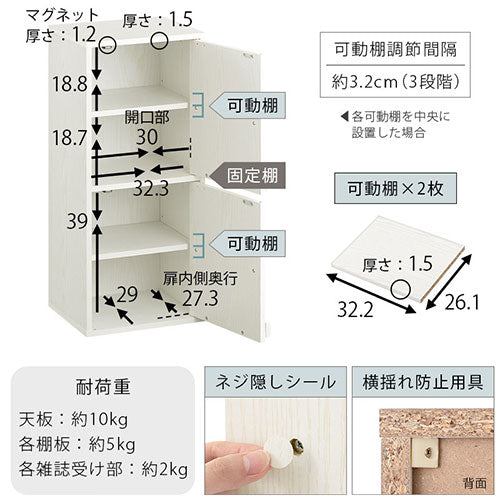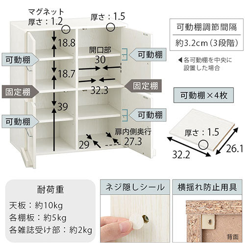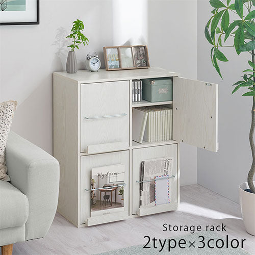 扉内は可動棚付きの大容量収納、扉には雑誌などが飾れ、おしゃれに収納物を隠せるラックです。