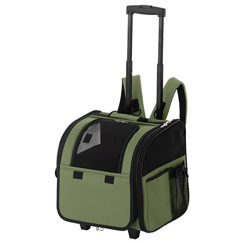 犬猫兼用、5kgまで対応のペット用ソフトキャリーカートです。キャスターバッグからリュックにも変身。災害避難時にも安心です。