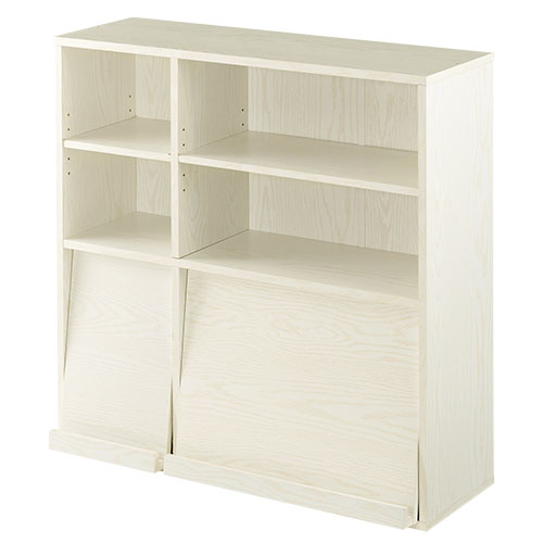 可動棚を備えたラックにフラップ扉2枚の組み合わせたオープンタイプと大小合わせて4枚のフラップ扉付きの収納ラックの2種類を用意しました。フラップ扉には表に雑誌などを飾り、内側にはA4までの大型本を収納することができます。