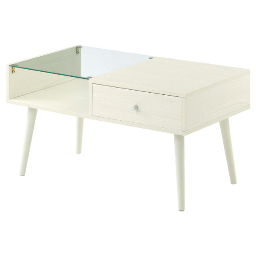 「引き出しとディスプレイ収納付き」ガラスセンターテーブル。ナチュラルな木目調 × 美しいガラス天板の組み合わせ。