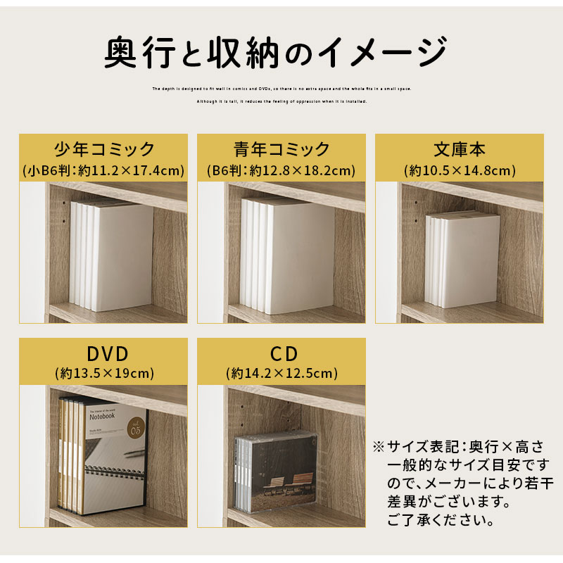 B6判、Blu-ray ディスクをメインに収納したい方にはとてもお勧めできます。一番見栄え良く収納できます。A5サイズの本をメインで収納したい方はご注意ください。