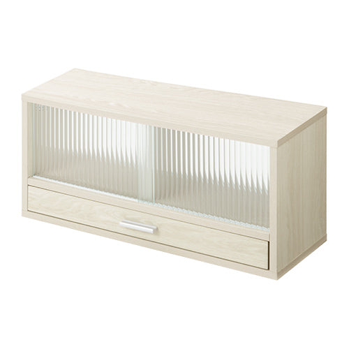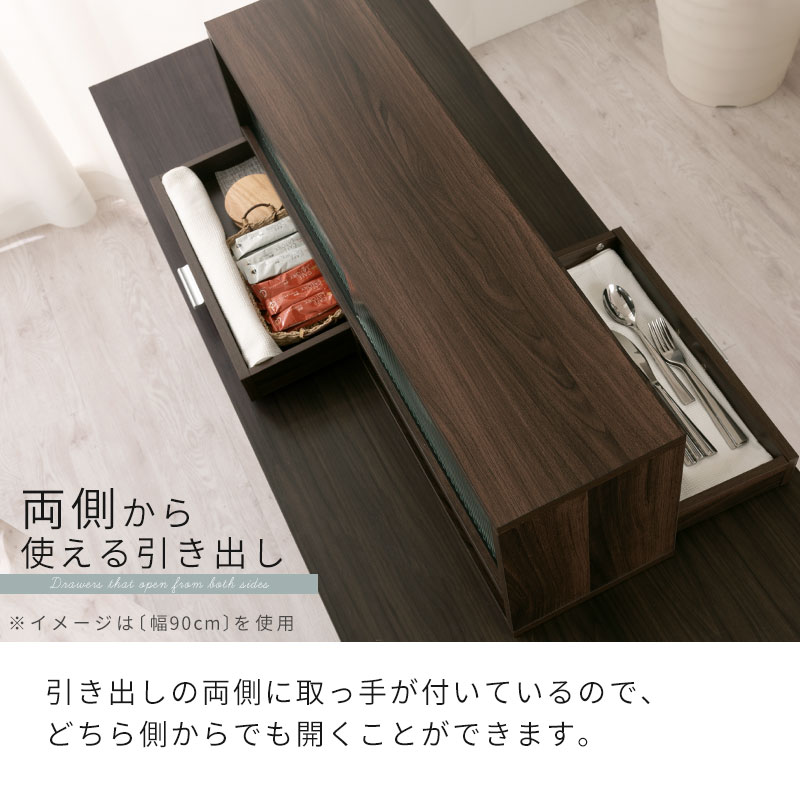 キッチンカウンターの上を使いやすく便利にする収納棚。ガラス戸と引き出しは両面仕様のため、キッチン・ダイニング側のどちらからでも取り出しが可能です。