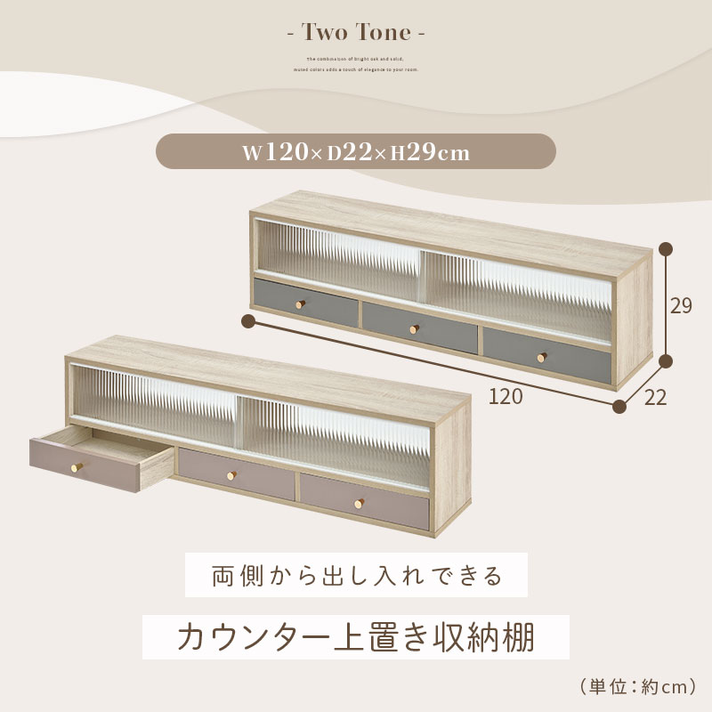 キッチンカウンターの上に置いて使える収納棚。両面仕様なので、ガラス戸と引き出しはどちら側からも使えます。