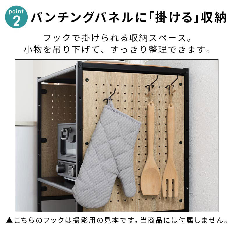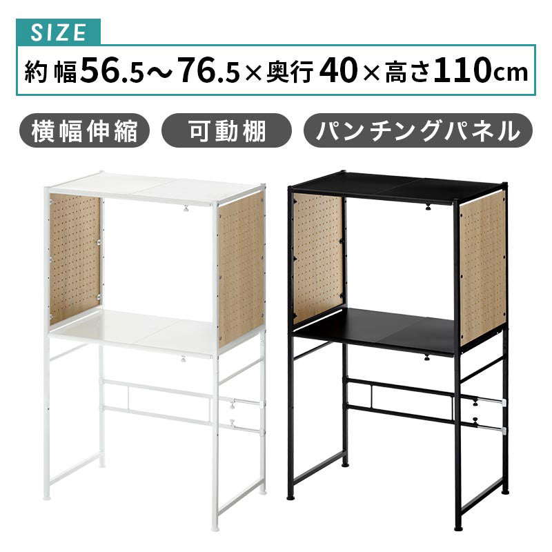 横幅伸縮・可動棚・パンチングパネル付き。しっかり片付くゴミ箱上キッチンラック。