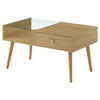 「引き出しとディスプレイ収納付き」ガラスセンターテーブル。ナチュラルな木目調 × 美しいガラス天板の組み合わせ。